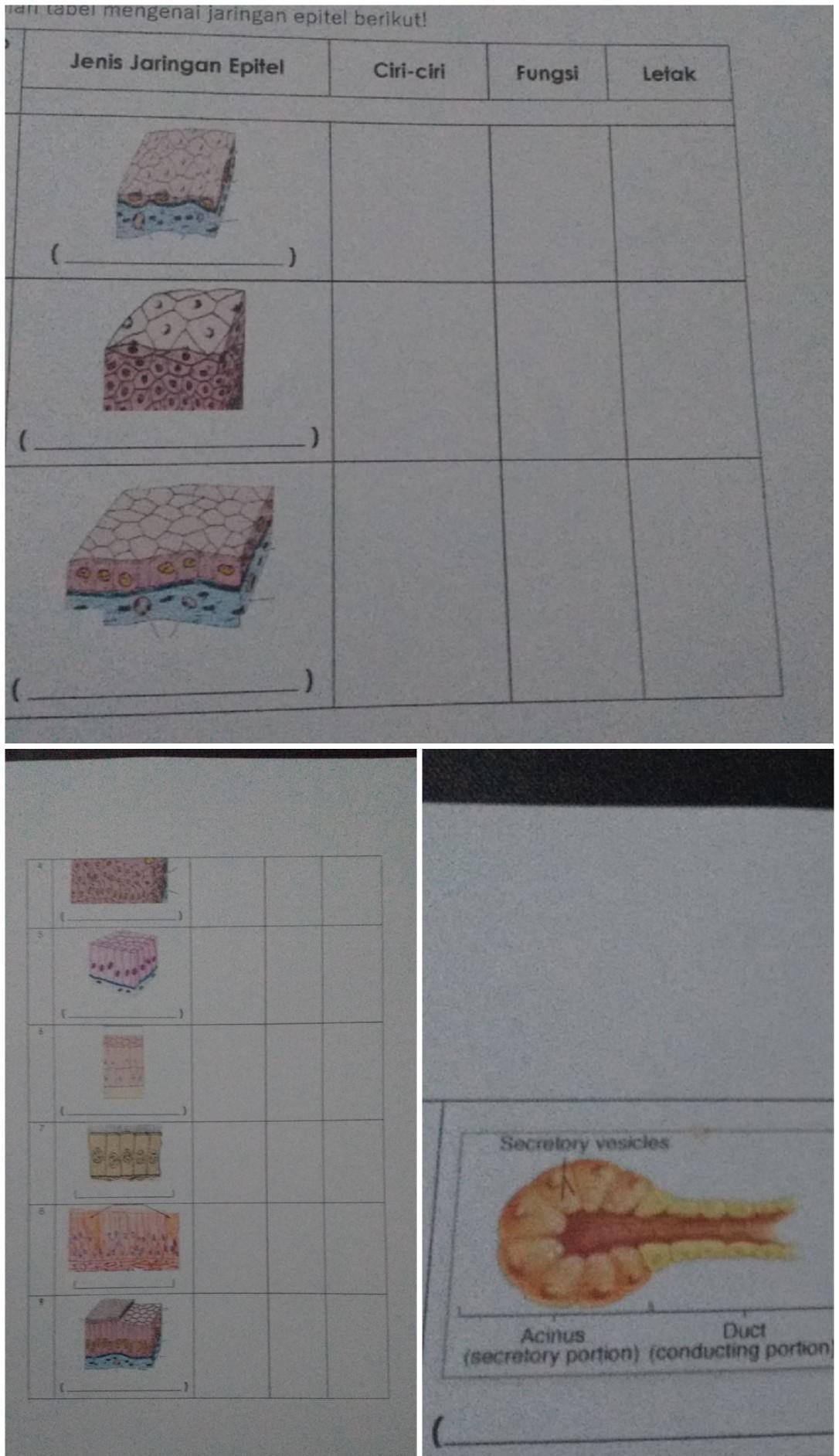 Jaringan pada manusia dan hewan. Dituangkan dalam bentuk gambar sebagai berikut : . Naskah skripsi berikut ini : Bagian ciri khusus setiap jaringan epitel pada gambar. Dalam perkembangan, pada suatu tempat epitel dapat melekuk, menjadi batang atau pipa sehingga menjadi epitel kelenjar.