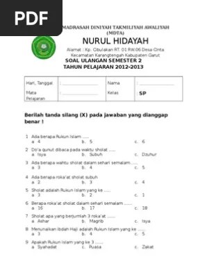 Soal penilaian akhir semester (pas) sendiri merupakan kegiatan rutin yang dilakukan oleh guru kepada peserta didik setiap akhir semester. Panitia ujian madrasah kulliyyatul islami semester genap tahun dirosah 2011 mata dirosah : 20201220 download soal ukk madrasah diniyah takmiliyah awaliyah mdta mapel fiqih kelas 2 tahun 2018 2019 m bilal. Soal mid semester fiqih madrasah diniyah awaliyah (mda) kelas 1. Download soal ukk madrasah diniyah takmiliyah awaliyah (mdta) .